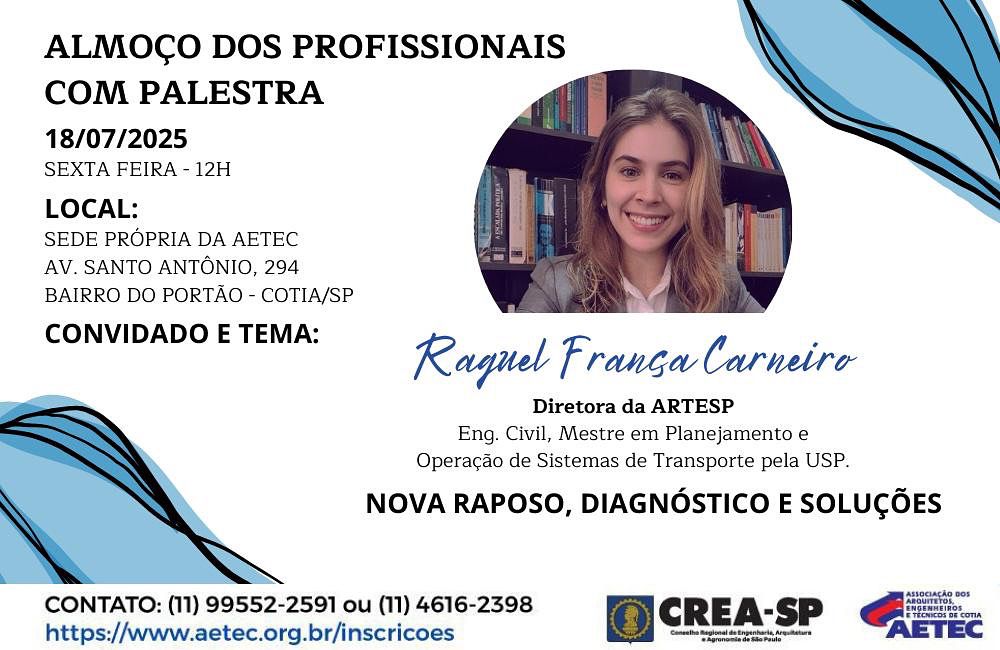 Nesta edição especial, teremos a honra de receber a Engenheira Civil Raquel França Carneiro, diretora da ARTESP – Agência de Transporte do Estado de São Paulo – para uma palestra imperdível sobre: